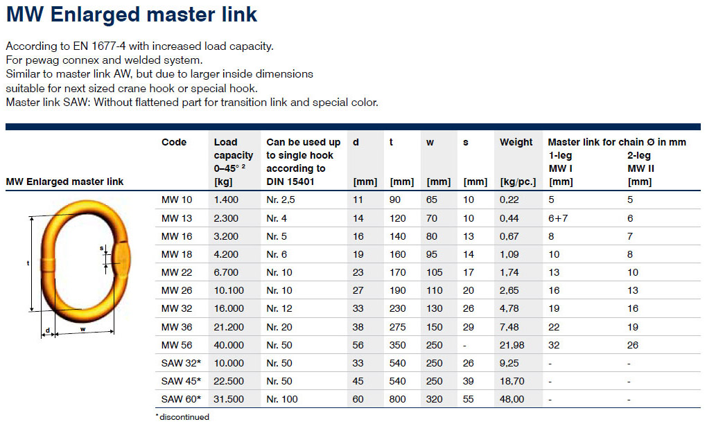 The MW enlarged master link must not be used for IV-leg chains, except when combined with BW transition links in VMW IV-leg assemblies.