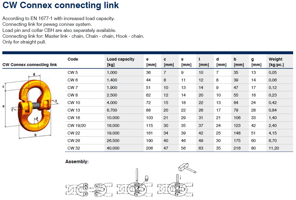 This universal connecting link consists of two symmetrical, die- forged halves, one bolt and one safety sleeve. For the expert connection of master ring and chain, chain and chain, chain and hook, master ring and hook and much more! Please note that the product is suitable for straight pull only and must be assembled by a competent person. Thanks to the sophisticated design, no special tool is required.