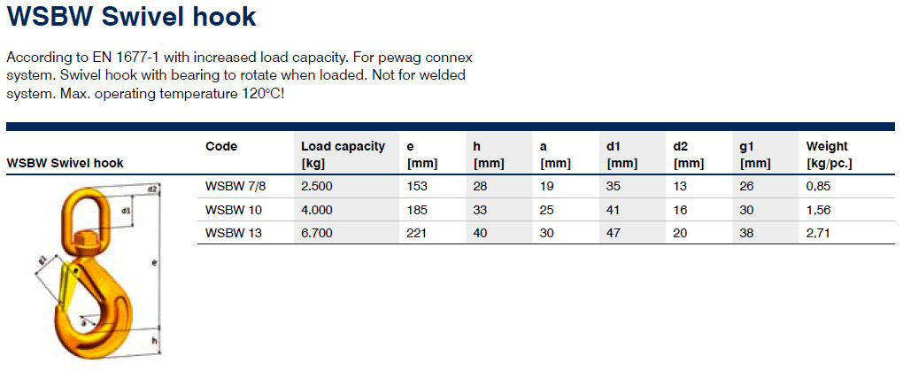 The WSBW swivel hook is suitable for the Connex systems, but also offers numerous other universal connection options thanks to its large swivel casing. Rotatability under load is ensured by an axial bearing design and comes as a special plus. The maximum operating temperature for this product is 120 °C. The product is manufactured according to EN 1677-2 with the mechanical values for G10.