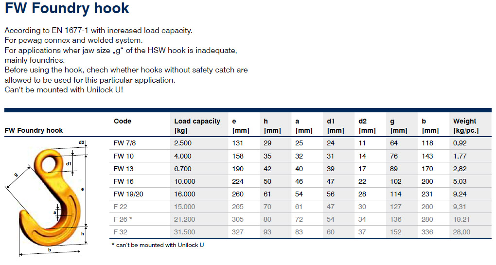 This hook comes with an extra-wide jaw and is used in applications where other hooks simply aren‘t up to the job. The model is frequently used in foundries and also does an excellent job when used with Connex and welded systems.