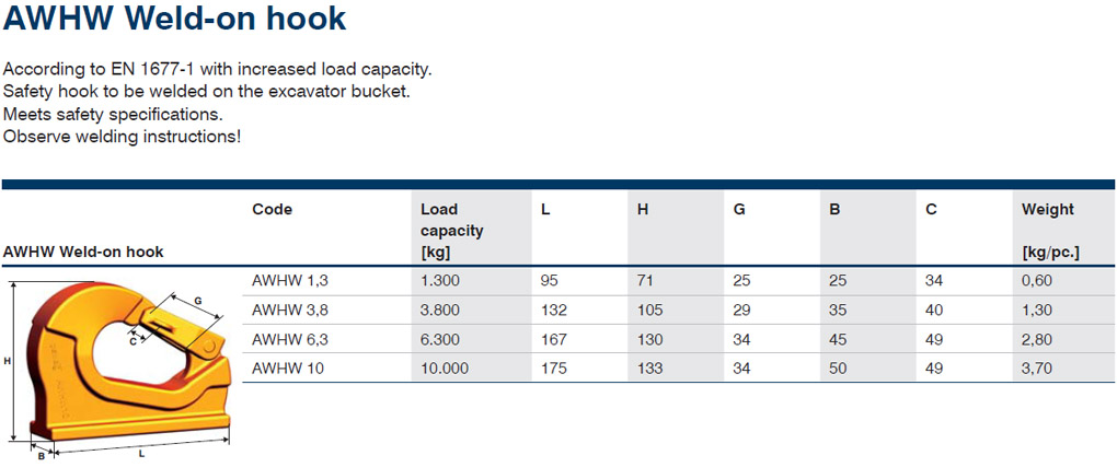 This high-strength hook is particularly well suited for welding onto excavator bucket, spreader beams etc. Its outstanding features include a die-forged, tempered safety catch, making it extrarobust. As the safety catch locks into the tip of the hook, it provides excellent protection against lateral shifting.