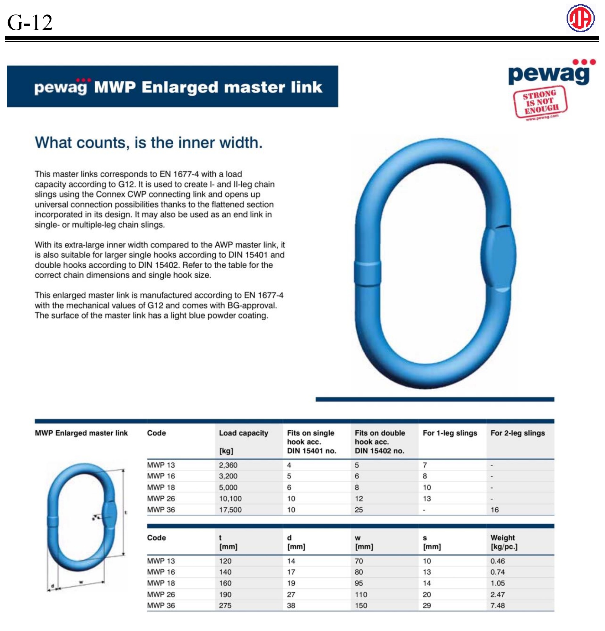 This master links corresponds to EN 1677-4 with the working load limit according to G12. It is used to create I- and II-leg chain slings using the Connex CWP connecting link and opens up universal connection possibilities thanks to the flattened section incorporated in its design. It may also be used as an end link in single- or multiple-leg chain slings.