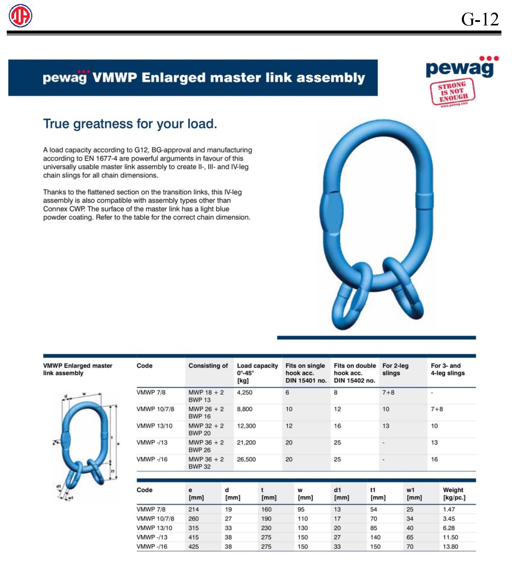 A working load limit according to G12, BG approval and manufacturing according to EN 1677-4 are powerful arguments in favour of this universally usable master link assembly to create II-, III- and IV-leg chain slings for all chain dimensions.