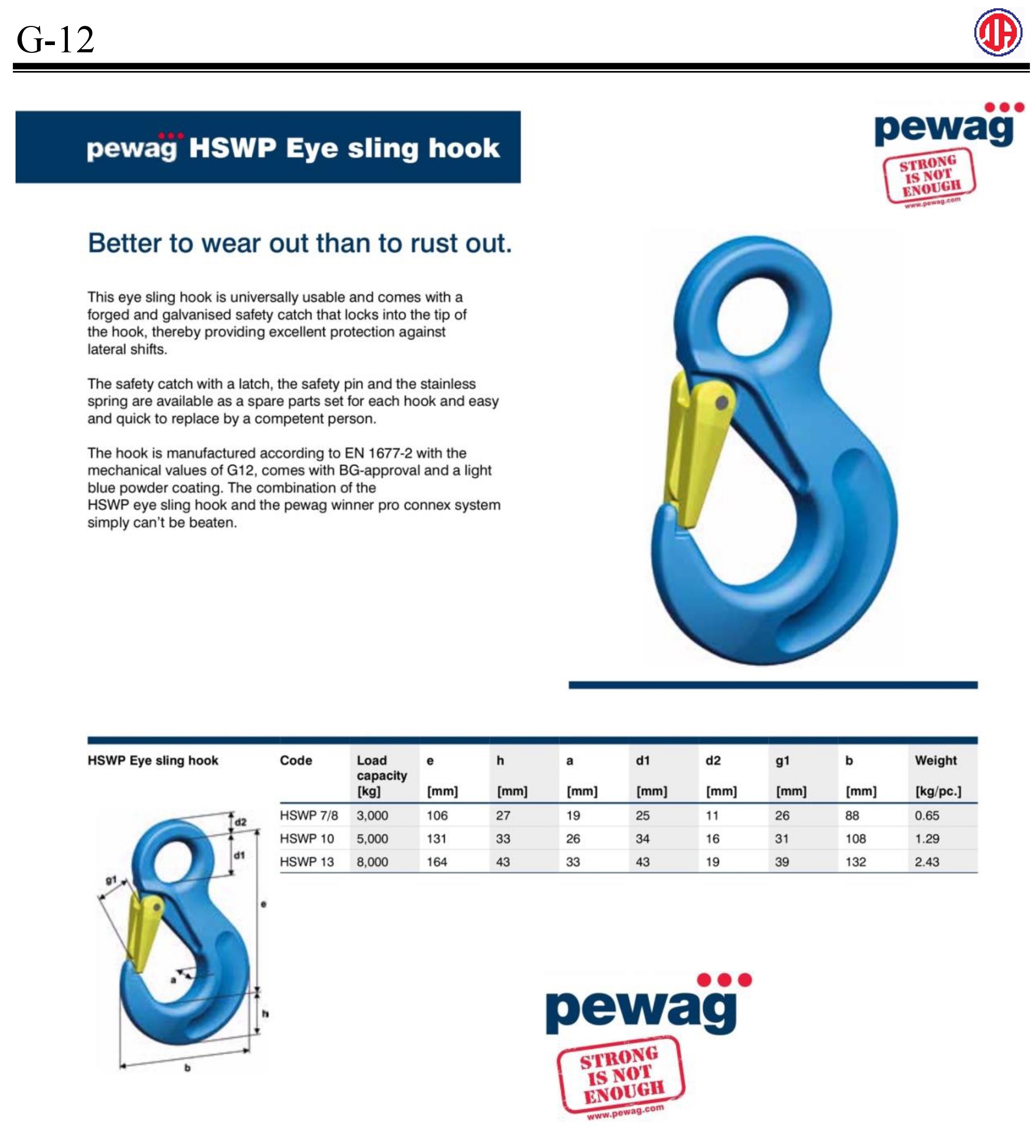 The hook is manufactured according to EN 1677-2 with the mechanical values of G12, comes with BG approval and a light blue powder coating (RAL 5012). In combination with the pewag winner pro Connex, it is simply unbeatable!