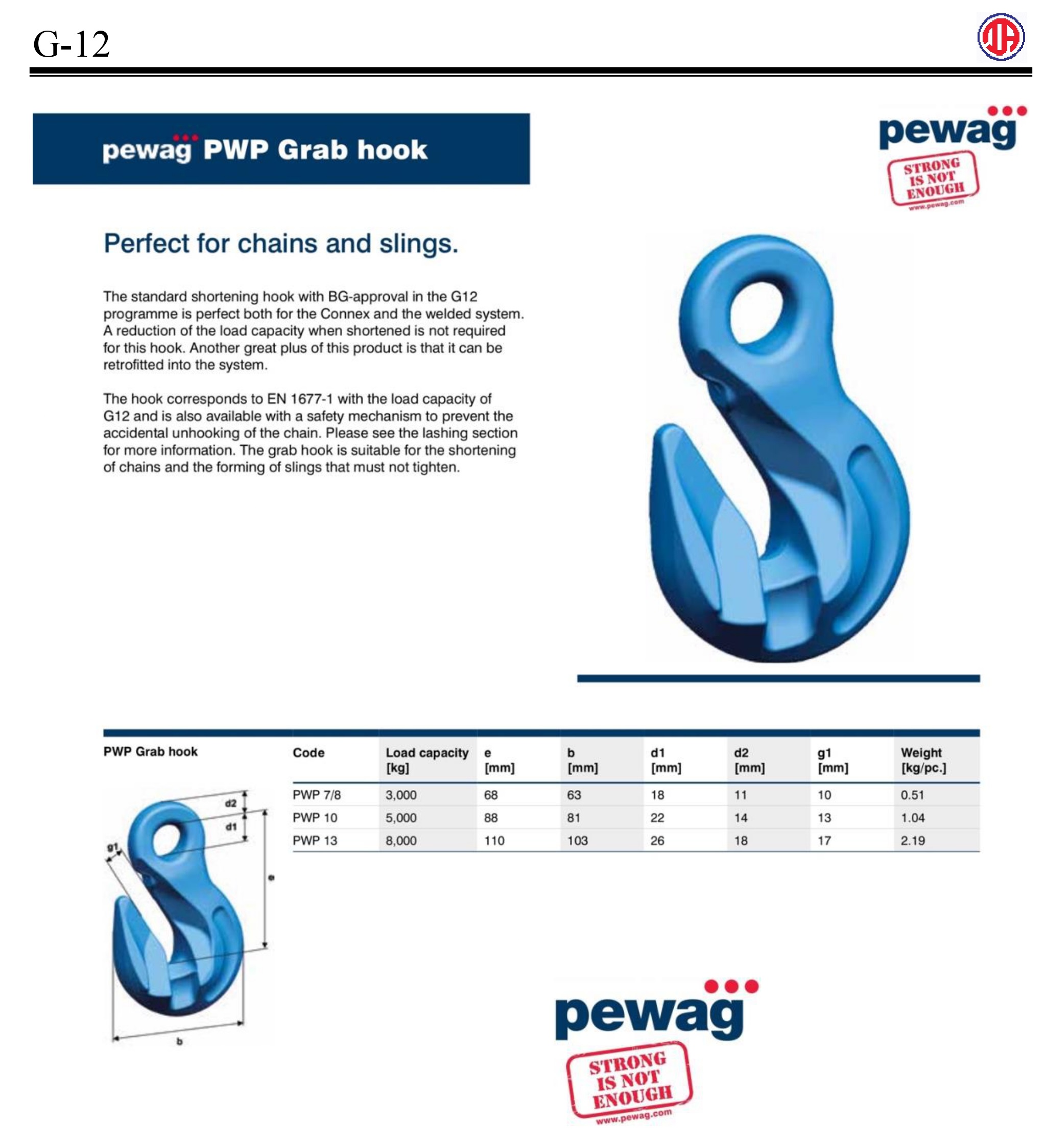 The hook corresponds to EN 1677-1 with the working load limits of G12 and is also available with a safety mechanism to prevent the accidental unhooking of the chain. The grab hook is suitable for the shortening of chains and the forming of slings that must not tighten.