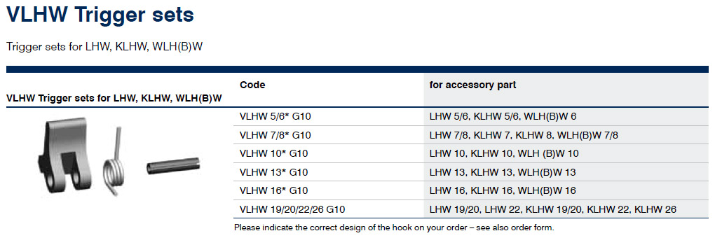 Trigger sets for LHW, KLHW and WLH(B)W safety hooks consist of a high-strength safety lever, a spring made of stainless steel and a retaining pin. The sets come with auxiliary material to facilitate assembly as well as detailed assembly instructions to make sure that your safety standards leave nothing to be desired.