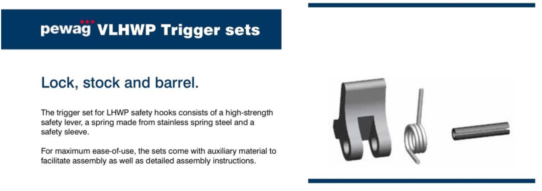The trigger set for LHWP safety hooks consists of a high-strength safety lever, a spring made from stainless spring steel and a safety sleeve.