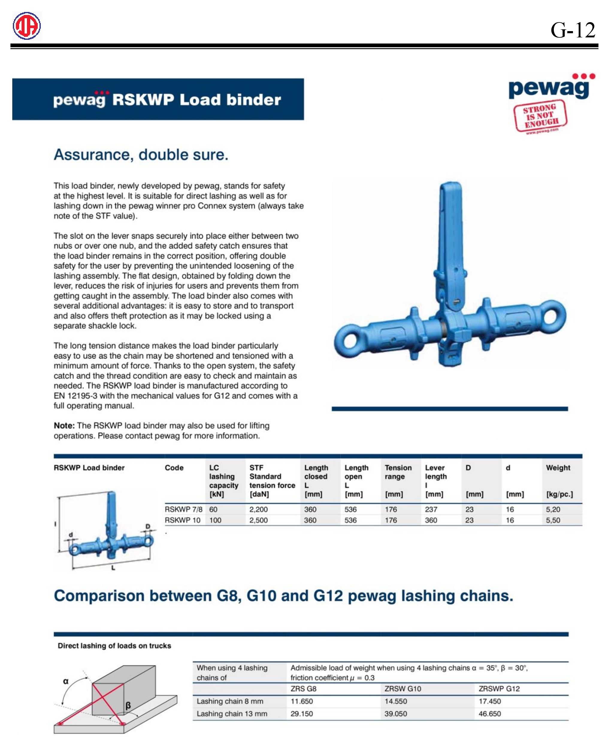 The long tension distance makes the load binder particularly easy to use as the chain may be shortened and tensioned with a minimum amount of force. Thanks to the open system, the safety catch and the thread condition are easy to check and maintain as needed. The RSKWP load binder is manufactured according to EN 12195?3 with the mechanical values for G12 and comes with a full operating manual.
