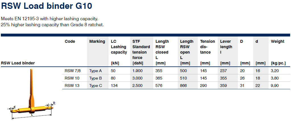 This load binder for one-part lashing chains in accordance with EN 12195?3 is also suitable for frictional lashing, depending on the selected lever length (always take the STF value into account!). It has a 25 % higher lashing capacity than grade 8 and is manufactured according to EN 12195?3.