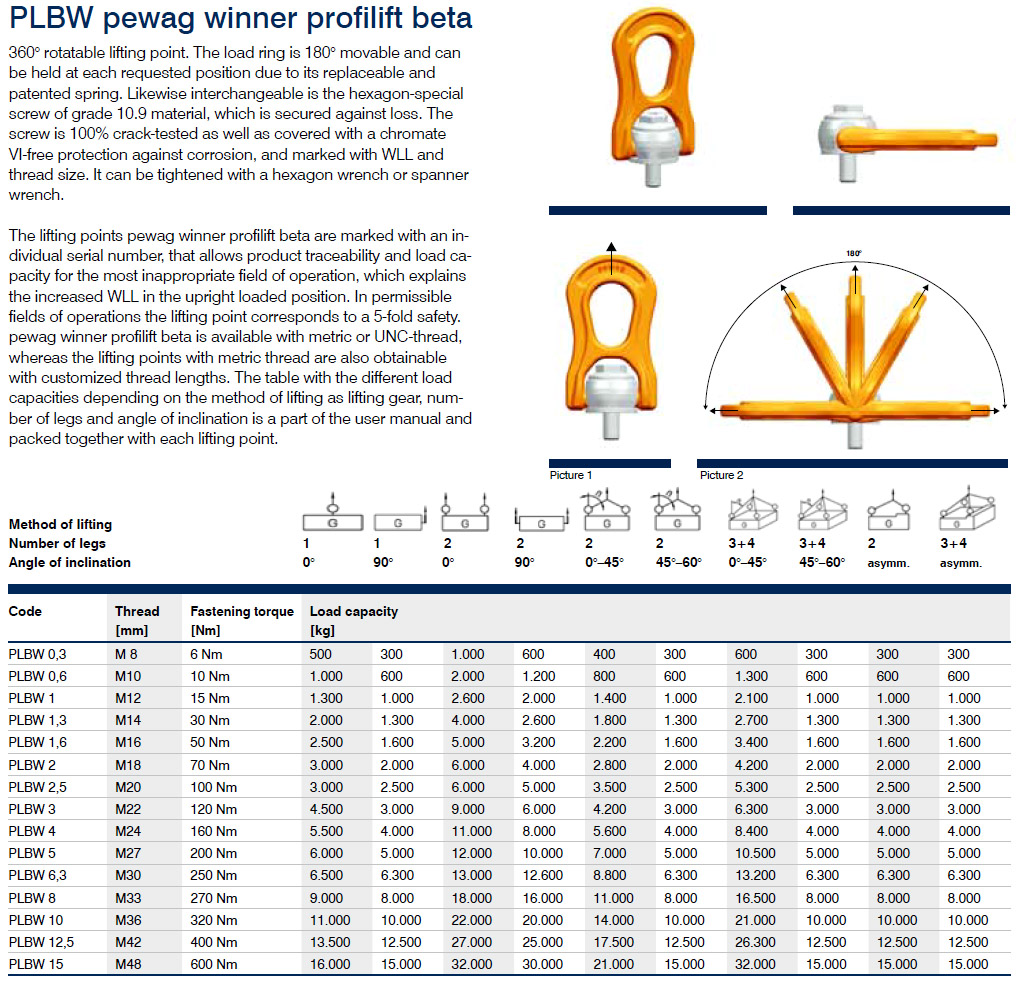 All load capacities, categorised by method of lifting, number of legs and angle of inclination are contained in a table that forms an integral part of the operating manual included with each lifting point.