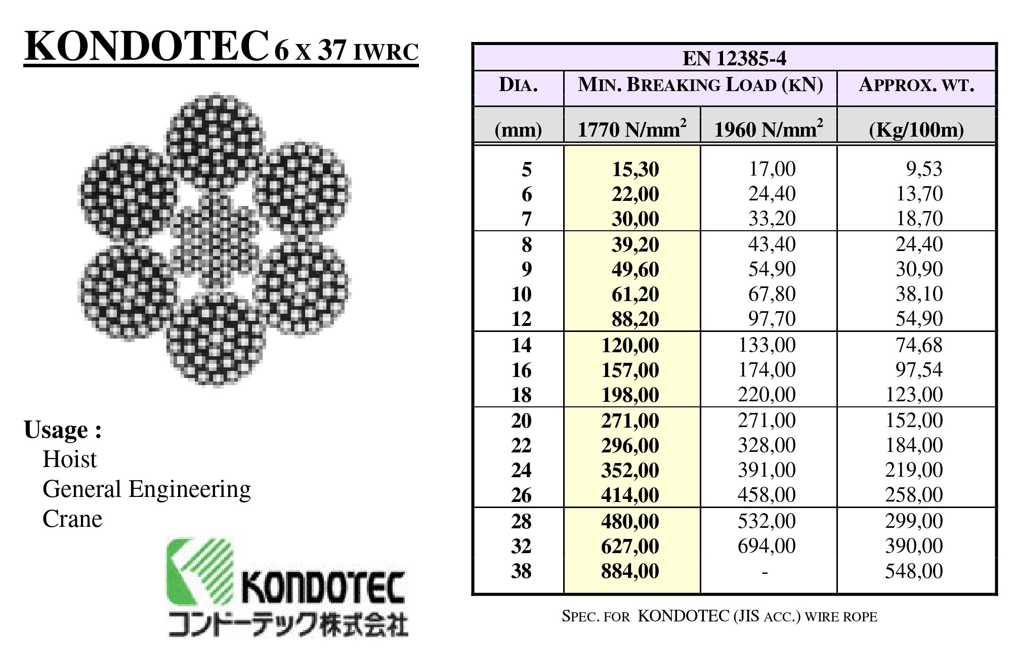 Wire Rope 6x37 IWRC KONDOTEC JIS