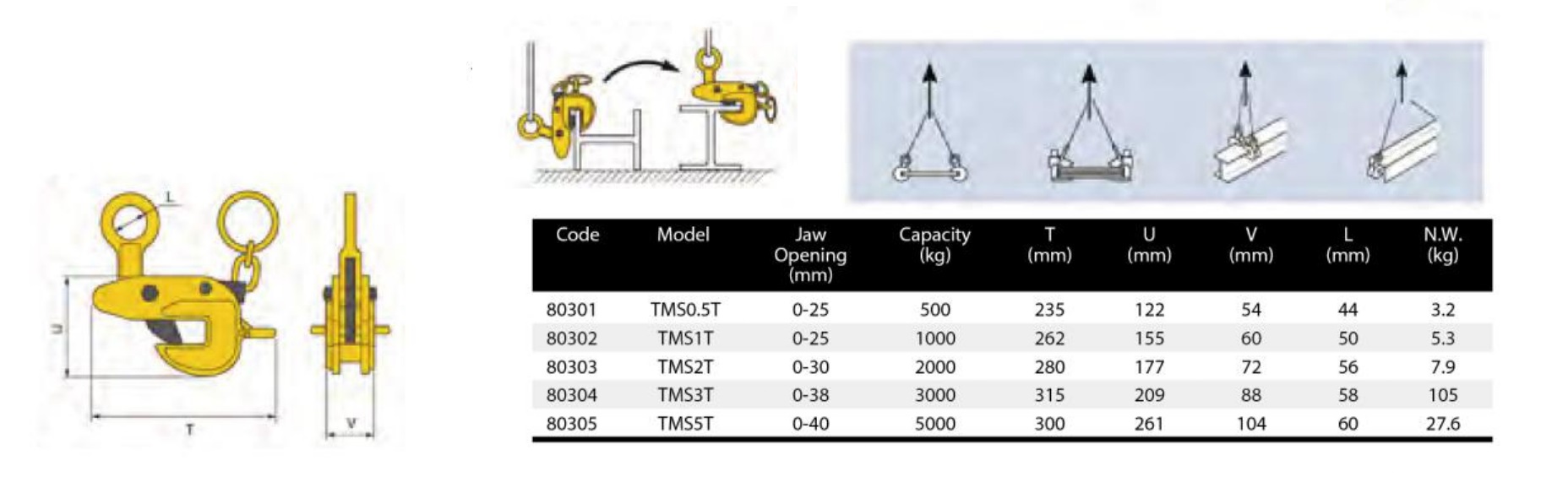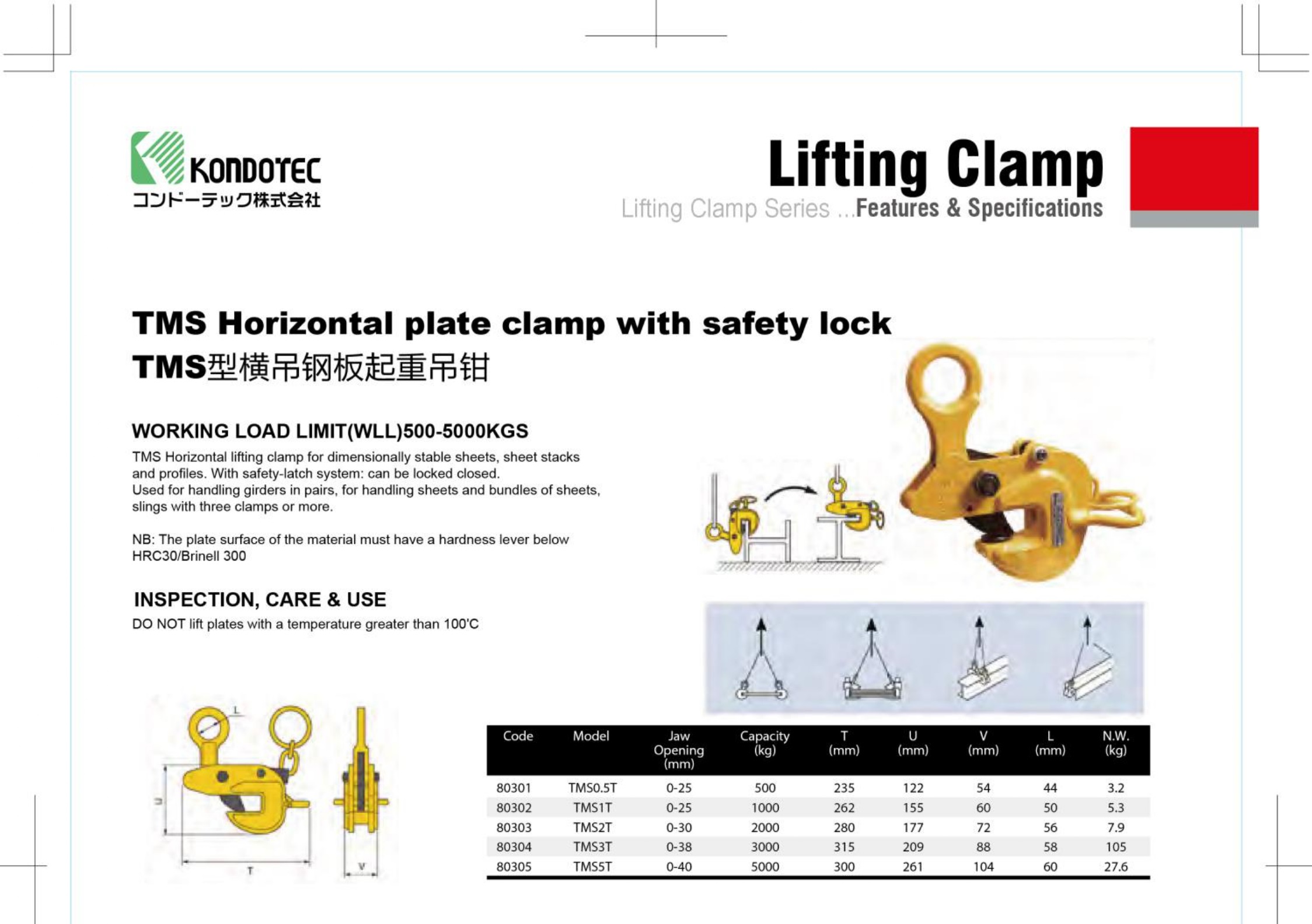 TMS Horizontal lifting clamp for dimensionally stable sheets, sheet stacks and profiles. With Safety-latch system: can be locked closed.