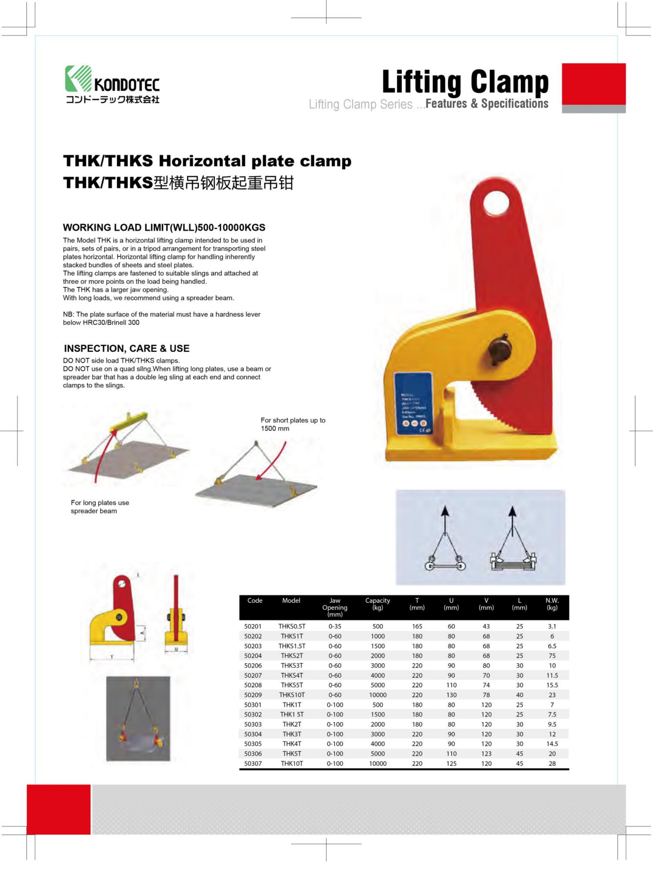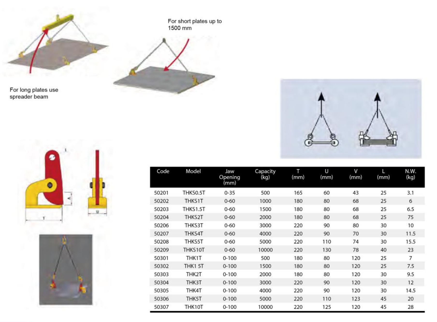 The Model THK is a horizontal lifting clamp intended to be used in pairs, sets of pairs, or in a tripod arrangement for transporting steel plates horizontal. Horizontal Lifting Clamp for handling inherently stacked bundles of sheets and steel plates.