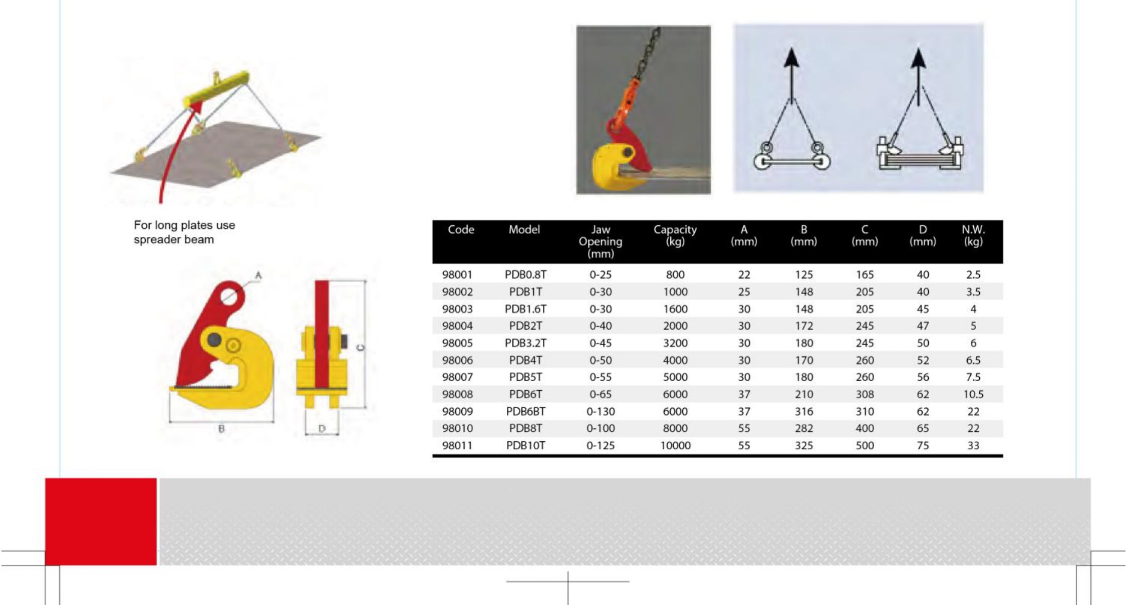 The PDB horizontal plate clamps are suitable for lifting and transport of steel plates, construction and profiled bar in gorizontal position. Manufactured from high quality carbon steel, Avoid snatch re shock load The screw jaw of the body can be changed, also have a safety button.