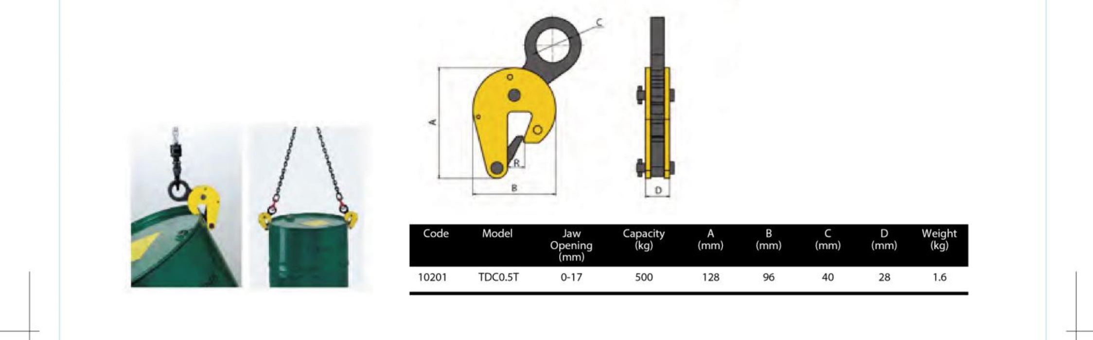 The TDC drum clamps has been designed to lift and transport drums. If moving empty or sealed drums then one clamps is sufficient on its own. Should you be lifting an open full drum, then two clamps should be used light a two leg chain sling This clamp is extremely light weight and very quick and easy to use.