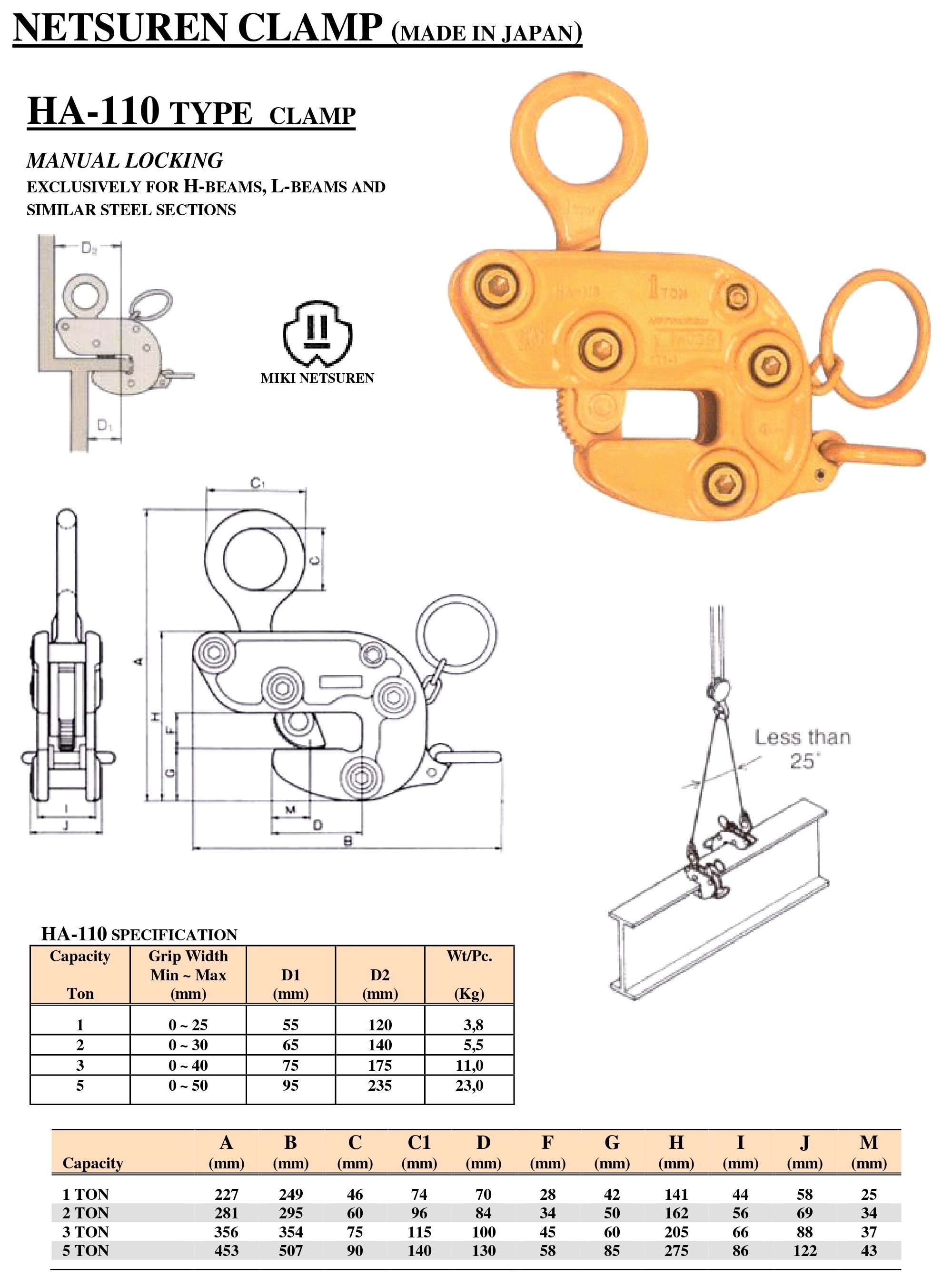 - Since the lower part of the main unit is split, the clamp can be attached width wise to both sides of beams, making it especially useful for H-beams.