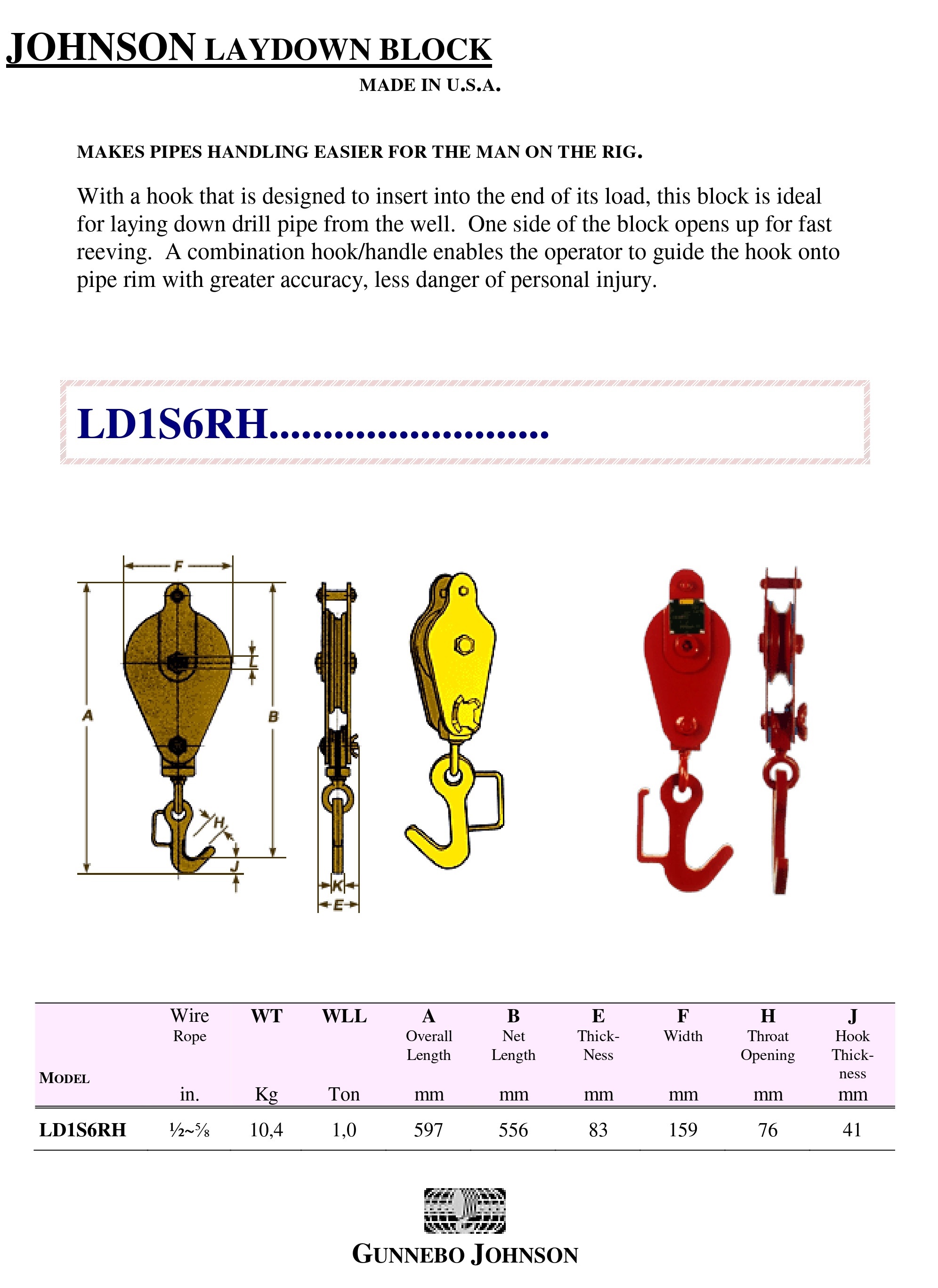 With a hook that is designed to insert into the end of its load, this block is ideal for laying down drill pipe from the well. One side of the block opens up for fast reeving. A combination hook/handle enables the operator to guide the hook onto pipe rim with greater accuracy, less danger of personal injury.