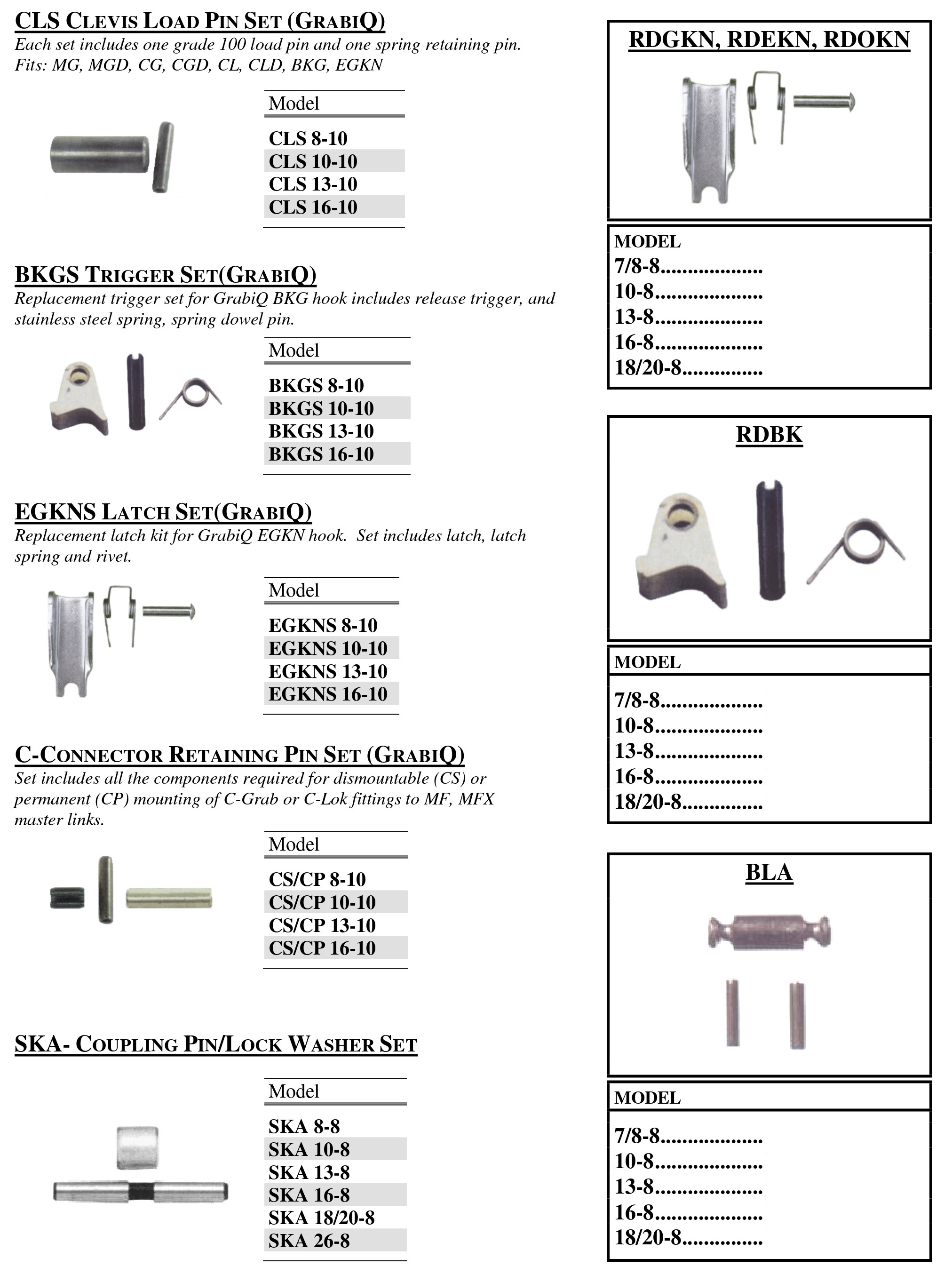 Replacement trigger set for Grabiq BKG hook includes release trigger, and stailess steel spring, spring dowel pin.
