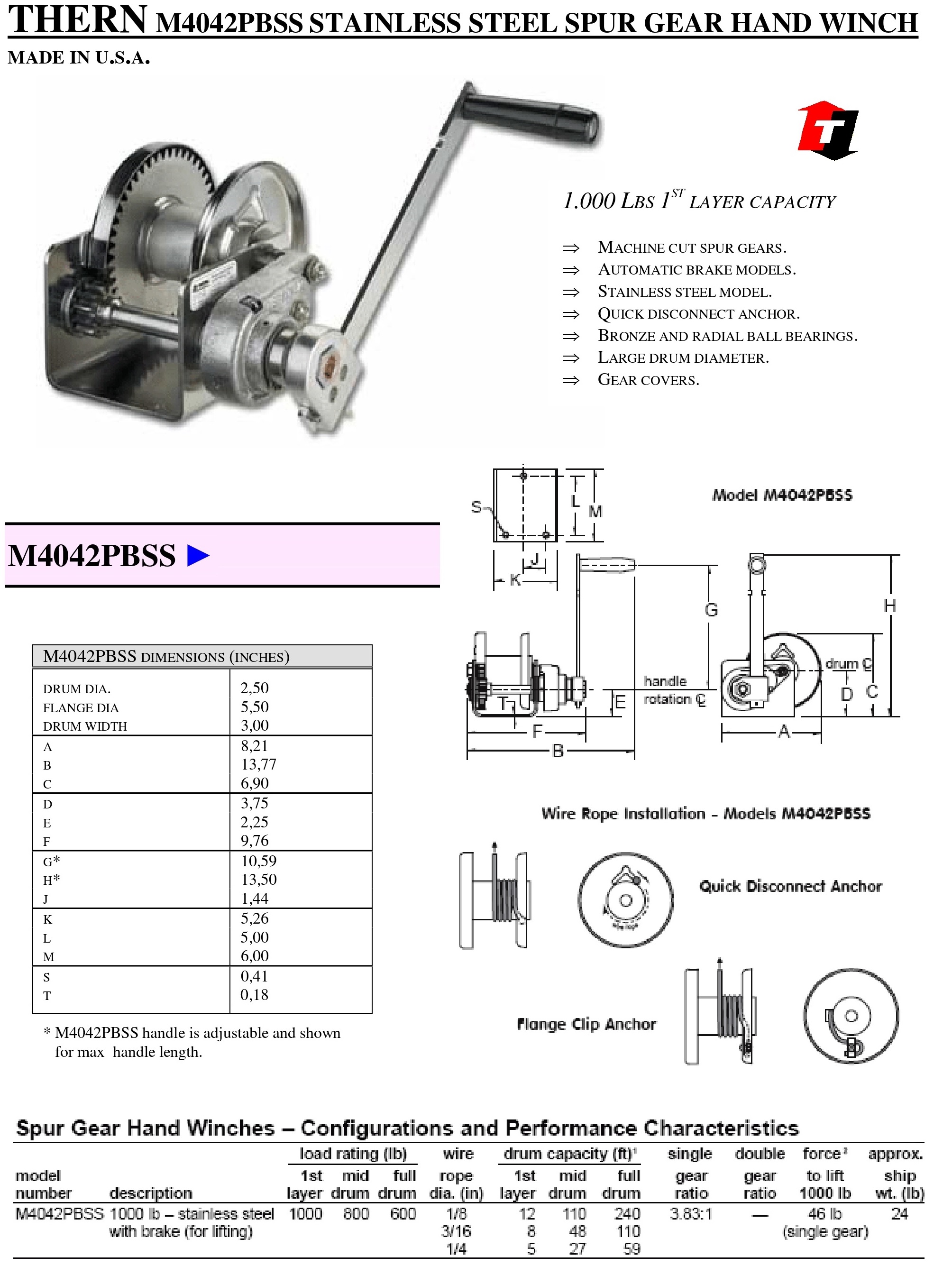 THERN M4042PBSS Stainless Steel Spur Gear Hand Winch