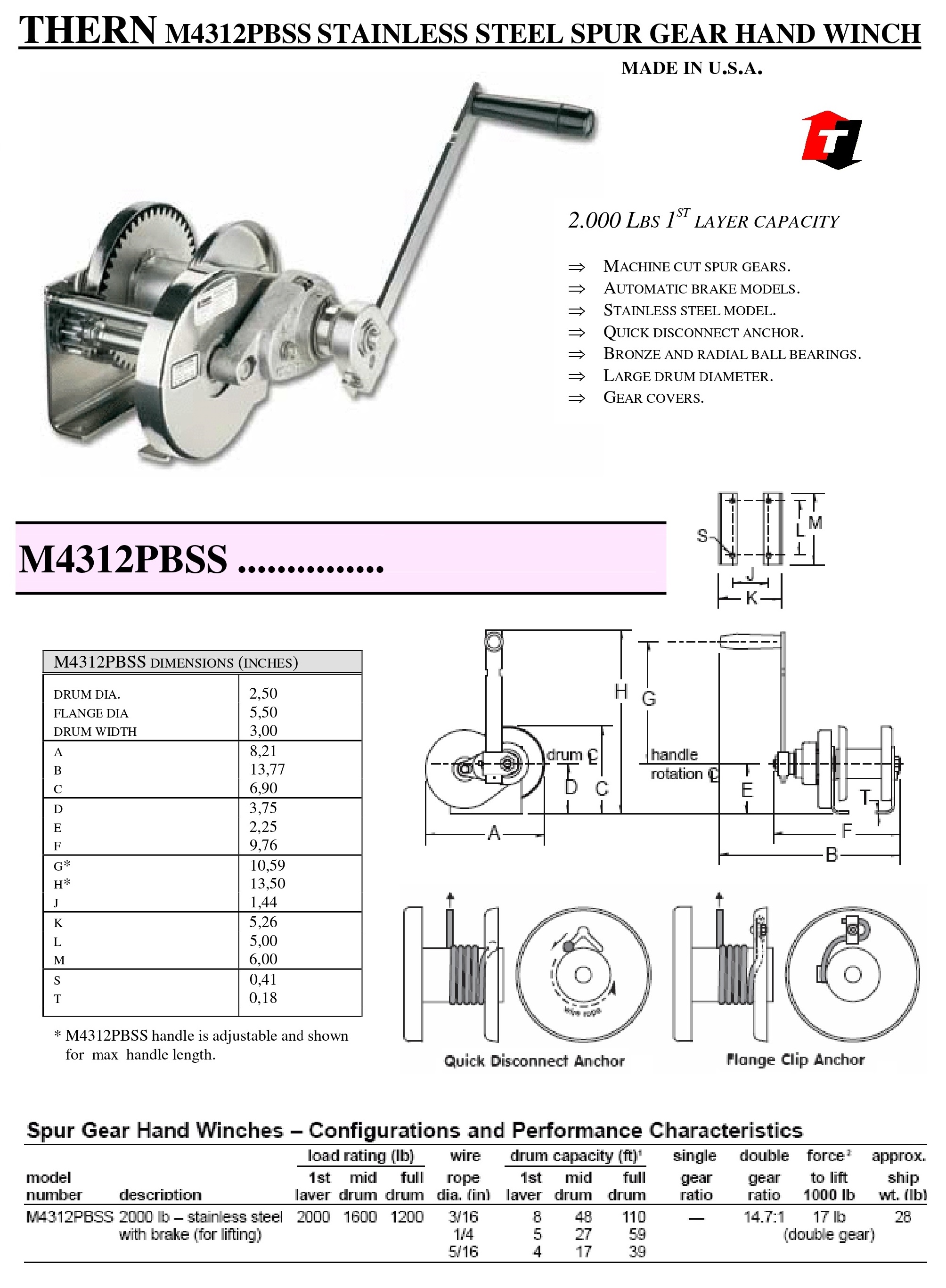THERN M4312PBSS Stainless Steel Spur Gear Hand Winch