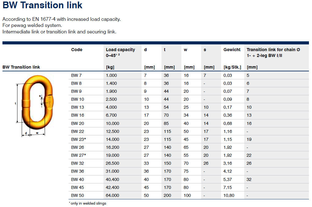 This link is versatile. It can be used as a transition and as an end link in welded systems. The flattened section opens up universal connection possibilities. The CE-marking and BG-approval ensure flawless quality. This transition link is manufactured according to EN 1677?4 with mechanical values according to G10 and is supplied with a full operating manual, offering users outstanding versatility at the highest level.